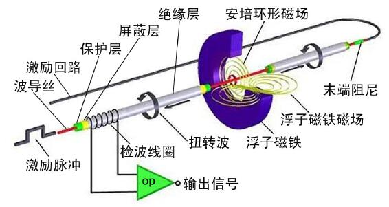 磁致伸縮液位計主要由電子部件、磁致伸縮波導絲、浮子等部分組成。測量時,電子部件產生一個電流“激勵”脈沖,該脈沖電流以光速沿波導絲向下運行,并在波導絲周圍形成周向安培環(huán)形磁場。當激勵脈沖電流產生的環(huán)形磁場與浮子內永磁鐵產生的偏置磁場相遇時,浮子周圍的磁場發(fā)生改變,從而使得由磁致伸縮材料做成的波導絲在浮子所在的位置產生一個感應扭轉波脈沖,該扭轉波以聲速由產生點向波導絲的兩端傳播,傳向末端的扭轉波被阻尼器件吸收,傳向激勵端的信號則被檢波裝置接收,并由電子部件測量出脈沖電流與扭轉波的時間差,再乘以扭轉波在波導絲中的傳播速度(固定量為2800m/s),即可計算出浮子產生扭轉波的位置與測量基準點間的距離,也就是液面的位置。磁致伸縮液位計傳感器原理見下圖。